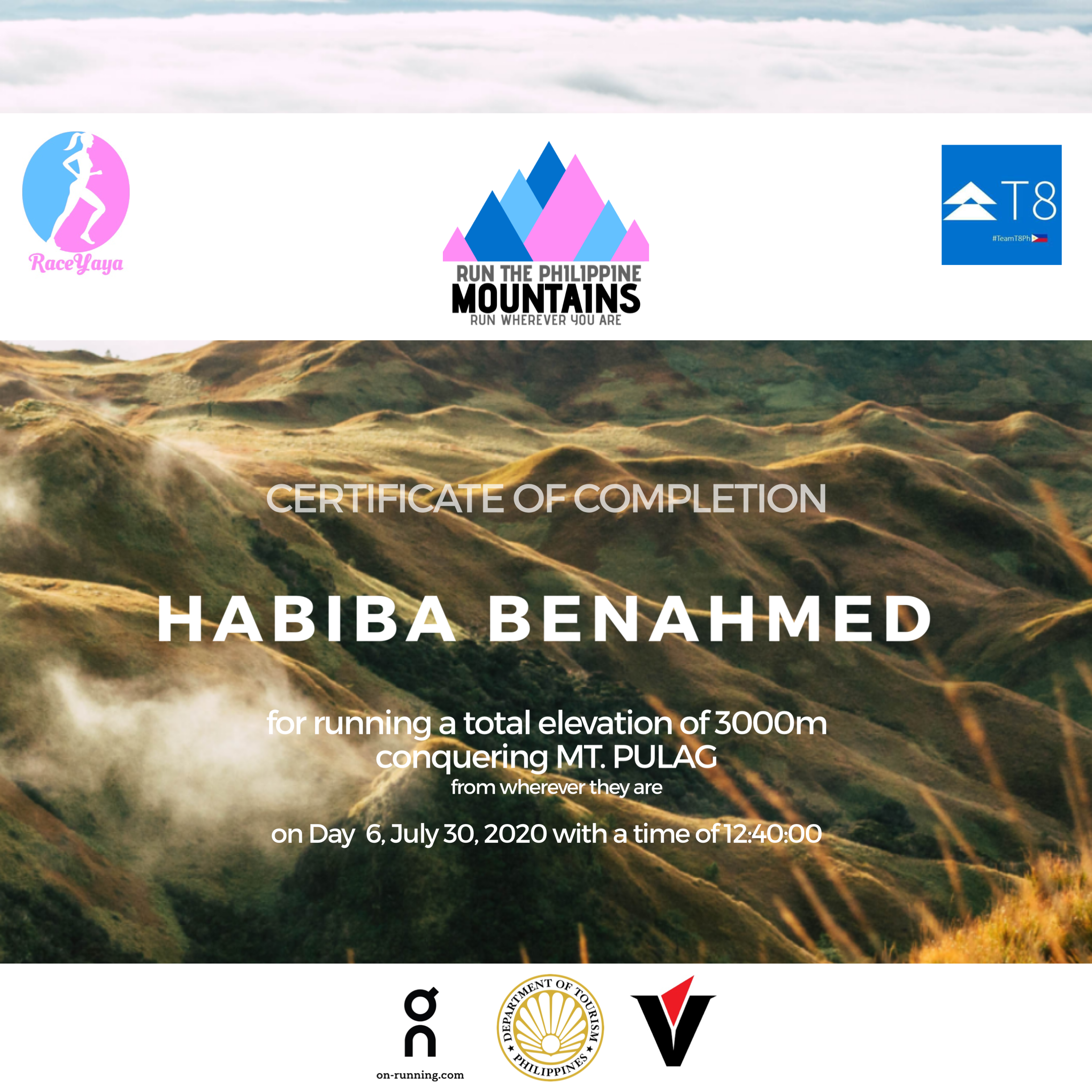 RaceYaya provided the online validation, tally and timekeeping and monitored individual performance. Winners and participants were treated with special loots and discounts from T8 Ultra Gears, AHON, On Running and Vitargo Philippines. The event also launched the special Philippine edition T8 Trucker Cap designed by a Filipino artist, Ara Villena.